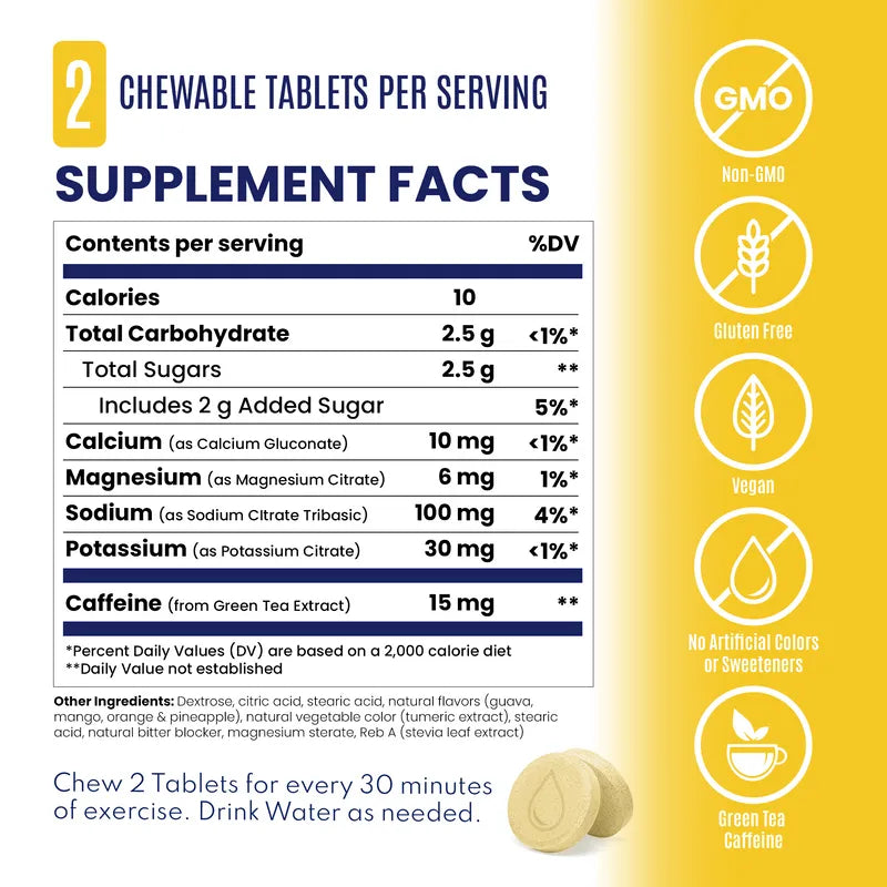 Take 2 tablets every 15-30 minutes during physical activity. The electrolytes in FastChews absorb more quickly when you let them dissolve in your mouth, so it's best to wait 2-3 minutes before eating or drinking.