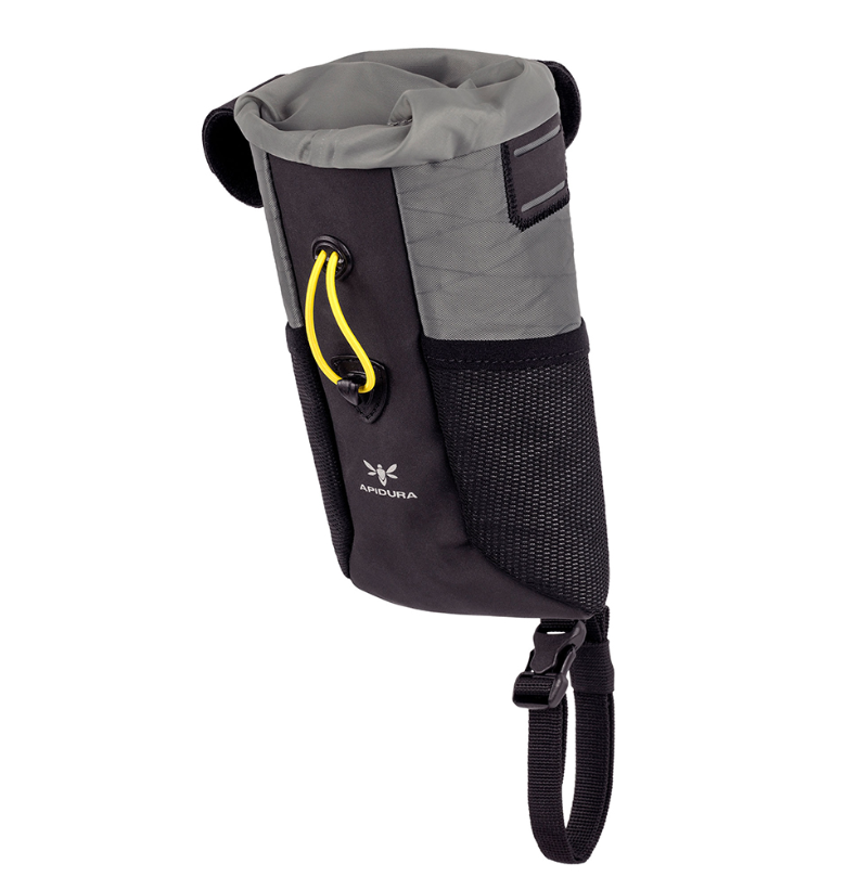 Attached firmly with a versatile three-point system, the stem bag easily fits on either side of the cockpit and works with aerobars and Jones bars. The bag’s contents are kept secure by a simple one-handed open and closure system, and a subtly tapered design prevents knee contact while pedaling out of the saddle.