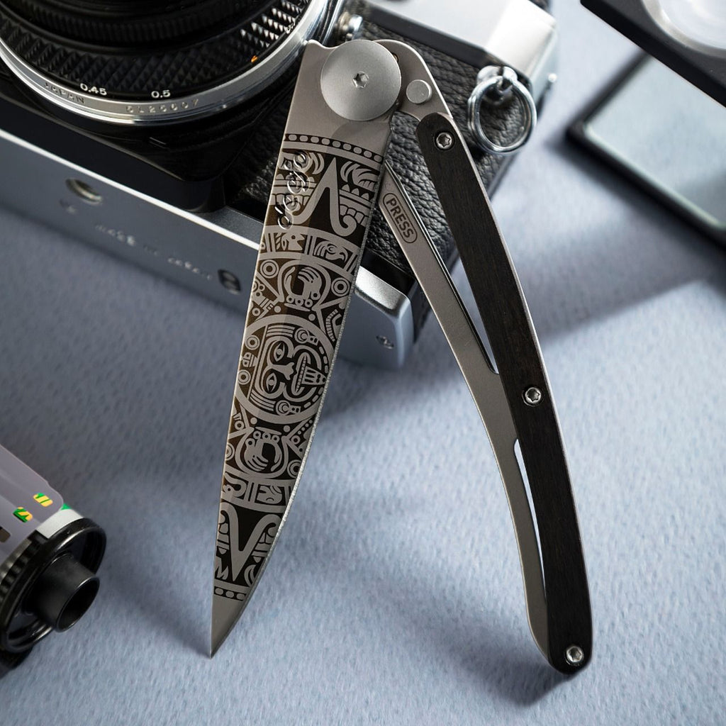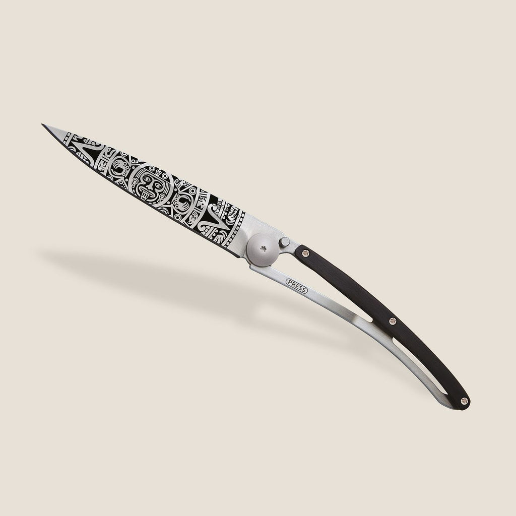 The ebony wood plate complements the elegant shaping of this thin blade, made popular by its exceptional cutting capacities and feather-light weight. Ebony wood, visually appreciated for its deep blacks, possesses the particularity of being virtually insensitive to humidity. This species of wood is thus the densest, the most resistant, and the most precious, ideal for this magnificent piece of cutlery.