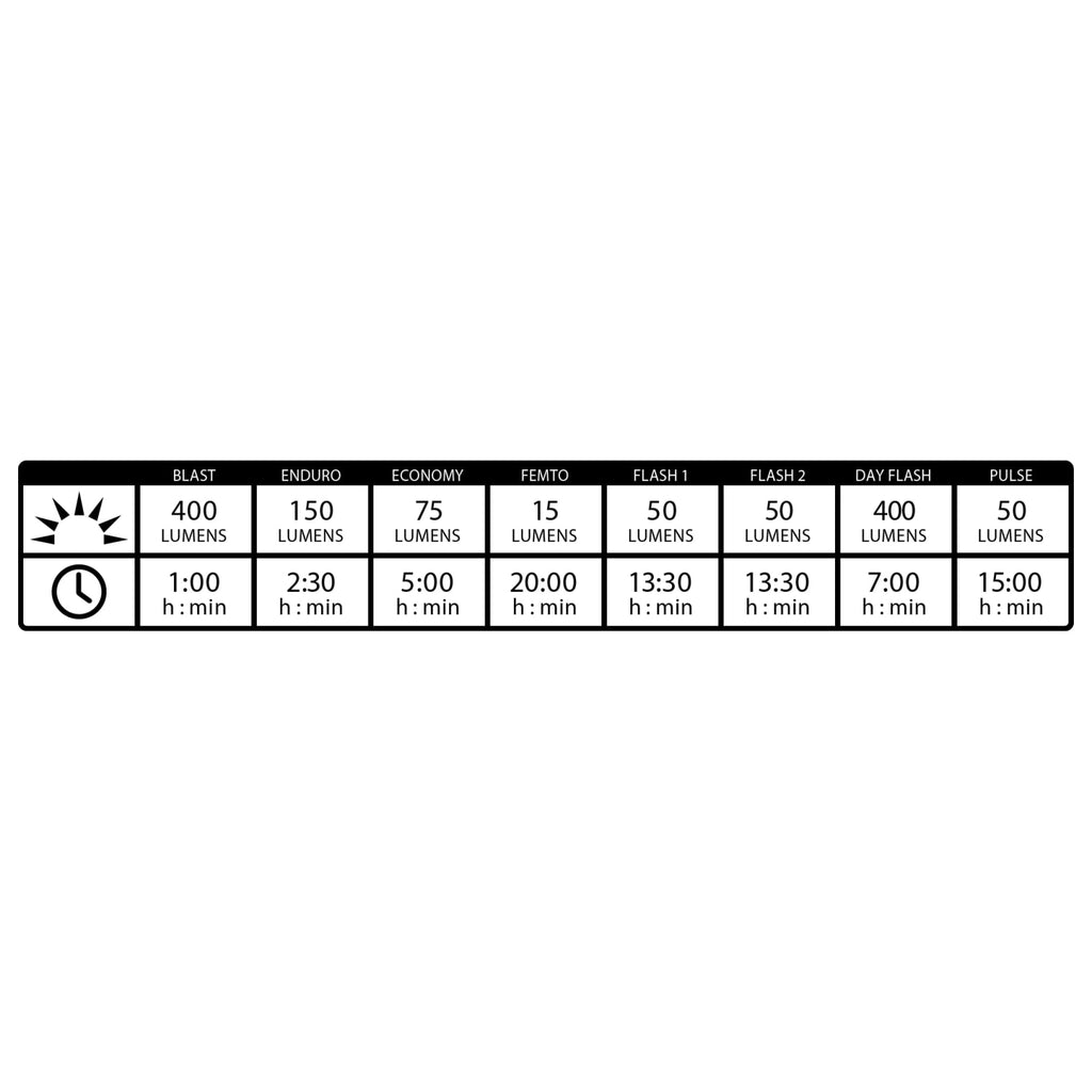 Lezyne Mini Drive 400XL LED Runtime Chart