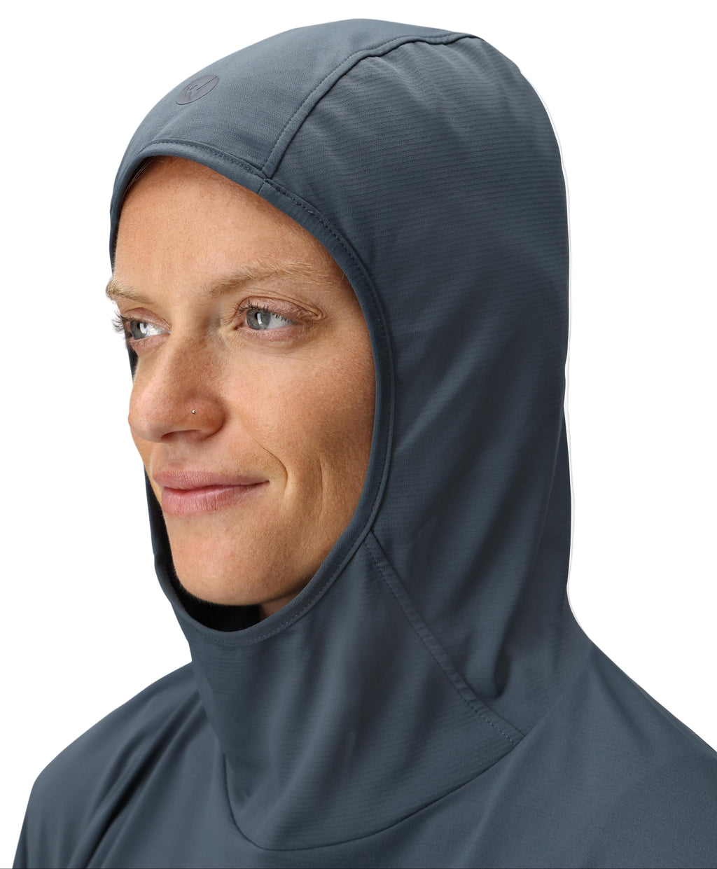 Blaze on with the AirExchange UPF Collection. From multi-day backpacks and alpine trail runs to weekend campouts with the fam, this is your new go-to sun hoody. AirExchange fabric is ultra-breathable, quick-drying, and sweat-wicking, with UPF 50 protection to keep your comfort in check and harmful UV rays at bay when temps, pace, or vert are soaring sky-high. When the sun pops out on the trail, pop up your scuba hood and slip into the thumbholes for maximum coverage. Dropped shoulders and abrasion-resistant seams keep you comfy, agile, and chafe-free during long, sunny days under the weight of a pack or racking sling. The side panel zippered pocket keeps car key, lip balm, or energy gels within reach—perfect for quick trail runs or when you're buckled into a harness or hip belt. Designed to be your trusted trail and alpine baselayer, this airy hoody also keeps you cool and burn-free on sunny beach, boat, and bike days.