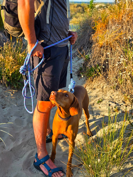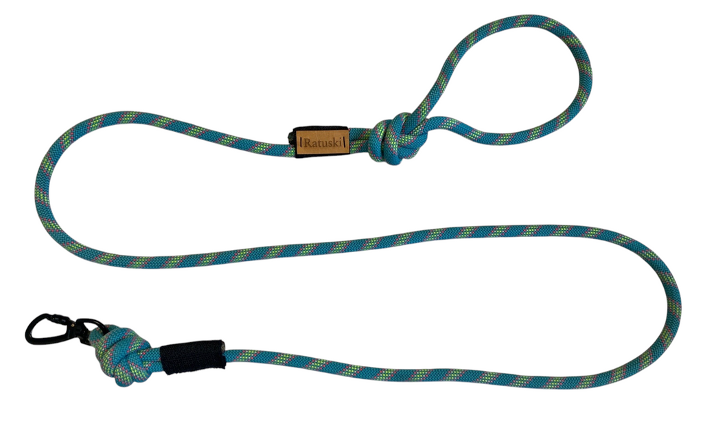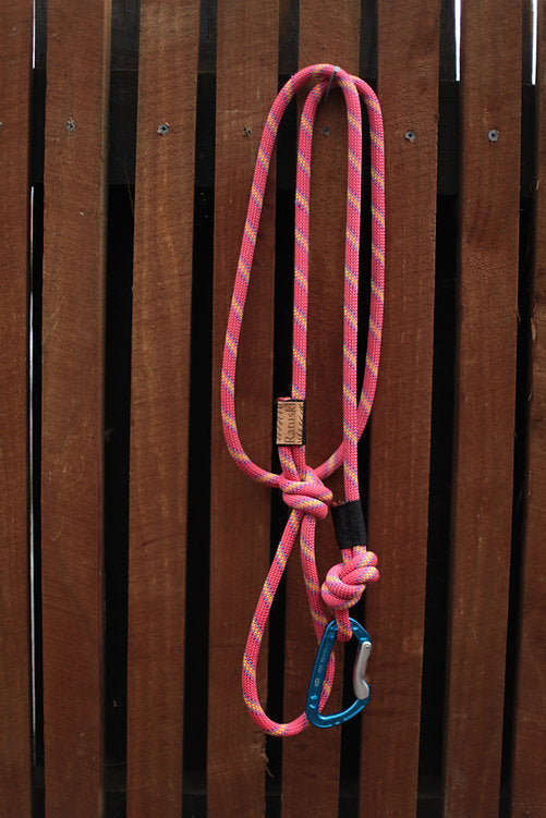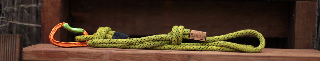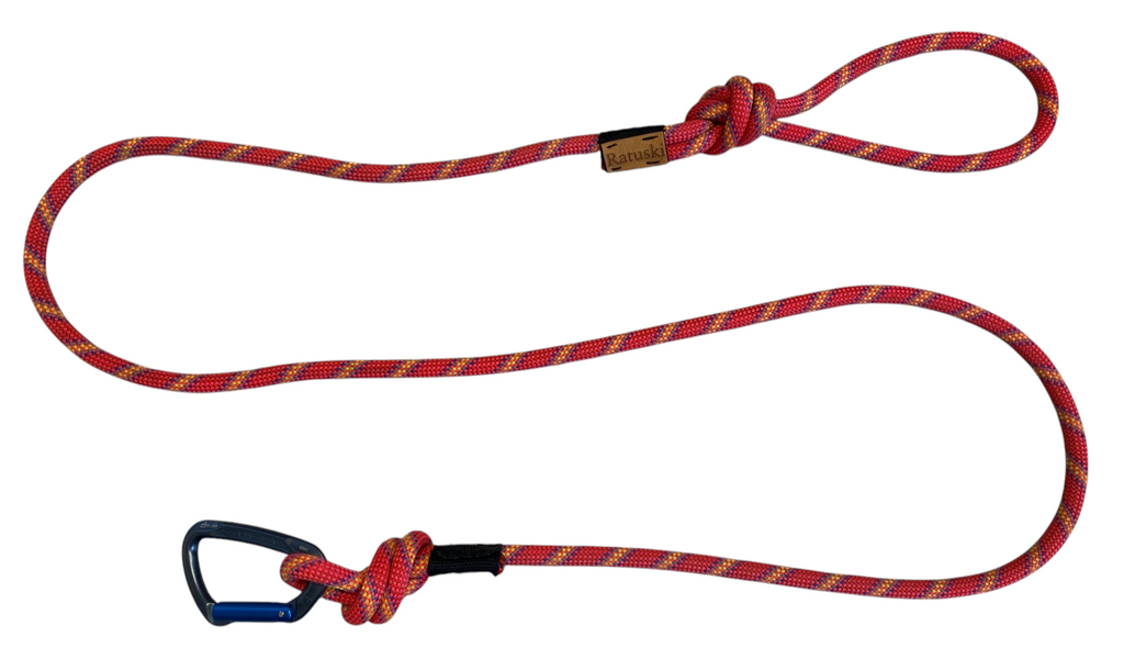 The rope section of the lead is created from a retired climbing ropes. They are no longer fit for taking big whips but are more than strong enough for your canine companion.