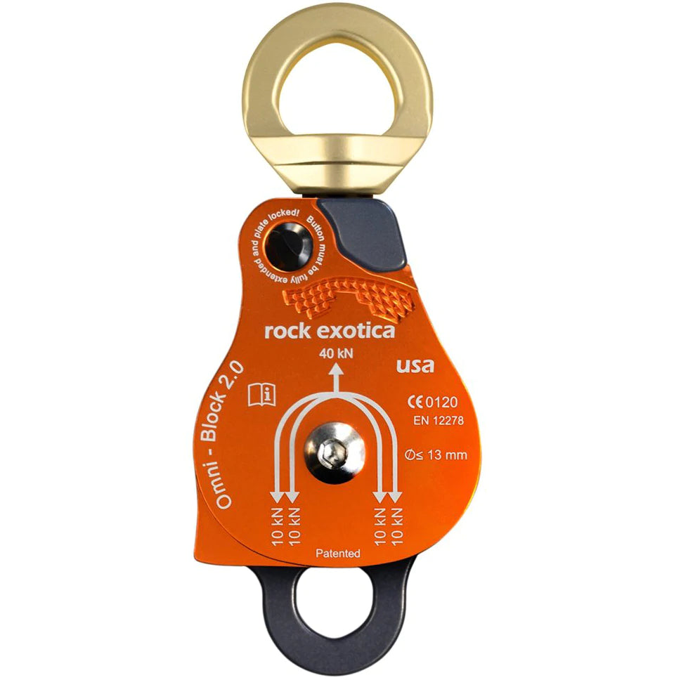 The Rock Exotica Omni-Block 2.0 Double can replace a conventional pulley, carabiner and swivel - its lighter, less expensive and saves valuable vertical space. In addition to trademark Omni features like an integrated swivel, and push-button access to the side plates, the 2.0" Double features a prussic-minding side plate and working load limit (WLL) of 10kN (based on a 4-1 ratio). Accepts rope up to 13 mm. Bottom becket on the Omni 2.0 Double ready for use in a fiddle block system. Made in the USA.