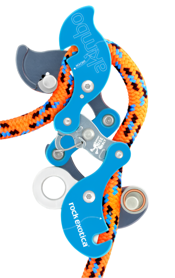 The Akimbo is a unique arborist climbing tool that enables the climber to ascend, descend and position on both stationary rope and moving rope systems. The Akimbo features rope contact surfaces (Upper and Lower Bollards) that adjust to accommodate a wide range of rope sizes to suit the climber's needs or preferences—all without tools or disassembling components. The Bollards can also be adjusted to increase or decrease friction to accommodate changes in climber weight, changes in environment, or adjust for natural wear of the Akimbo's contact surfaces.