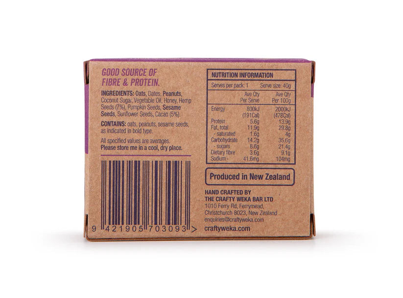 Ingredients: Oats, Dates, Peanuts, Coconut Sugar, Sunflower Oil, Manuka Blend Honey, Hemp Seeds (7%), Pumpkin Seeds, Sesame Seeds, Sunflower Seeds, Cacao (5%)