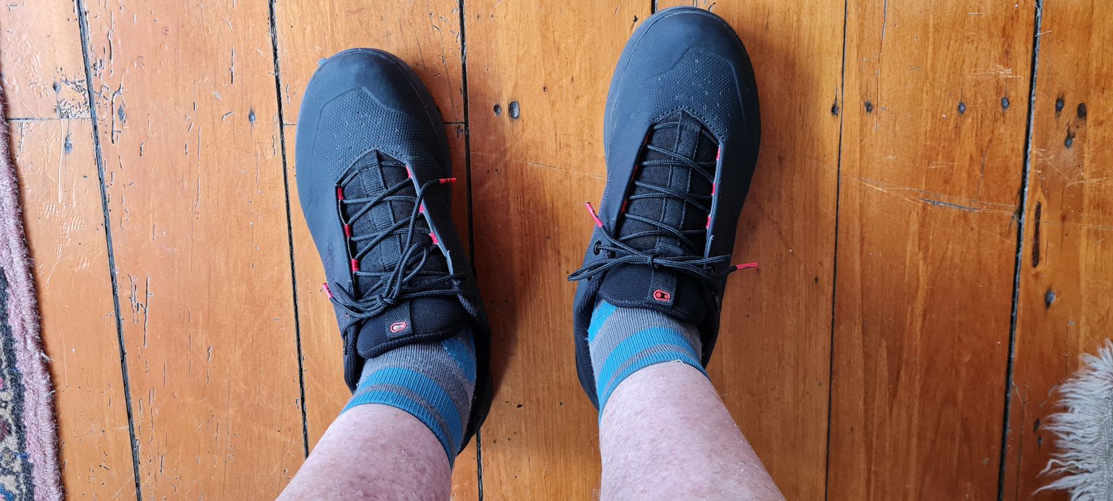 The tread pattern is designed for traction off the bike. Directionally angled and spaced toe and heel lugs offer traction for hiking up or down steep terrain. The ramped toe provides walkability on steep terrain.