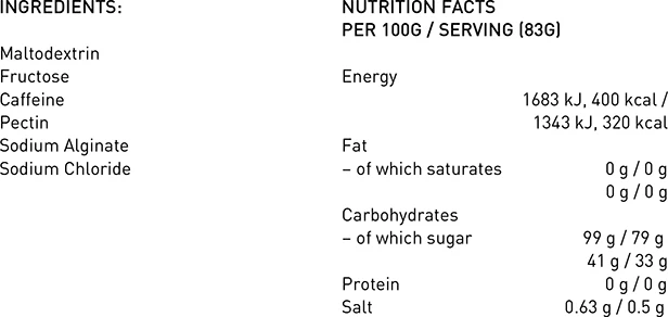 Studies have shown that our bodies can make use of up to 90 grams of carbohydrates per hour. One DRINK MIX 320 CAF 100 sachet, mixed with 500 ml of water contains 80 grams of carbohydrates.
