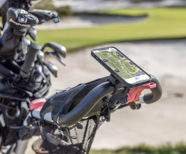 Using our patented dual-stage lock, your phone will stay secure on your golf buggy/cart or stroller/pram.