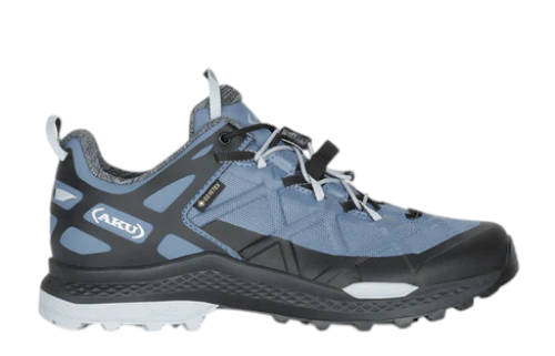 Footwear designed for fast hiking; dynamic and reliable even on the most difficult routes. ROCKET DFS GTX adopts the innovative Vibram tread with Traction Lug technology that improves traction and grip by 25% thanks to the special design. The upper has a crossed rib structure and is protected by a 3D print layer. The exclusive AKU Dual Fit System (DFS) technology, here made in the speed hiking version, allows you to vary the degree of precision of the fit by simply acting on the two different lacing systems. It is built with the AKU Elica Natural Stride System technology to promote biodynamic efficiency.