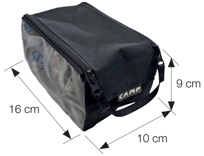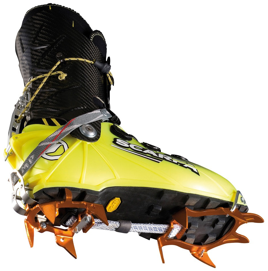 • Dyneema® linking strap between toe and heel piece allow the crampons to fold on themselves for packability.