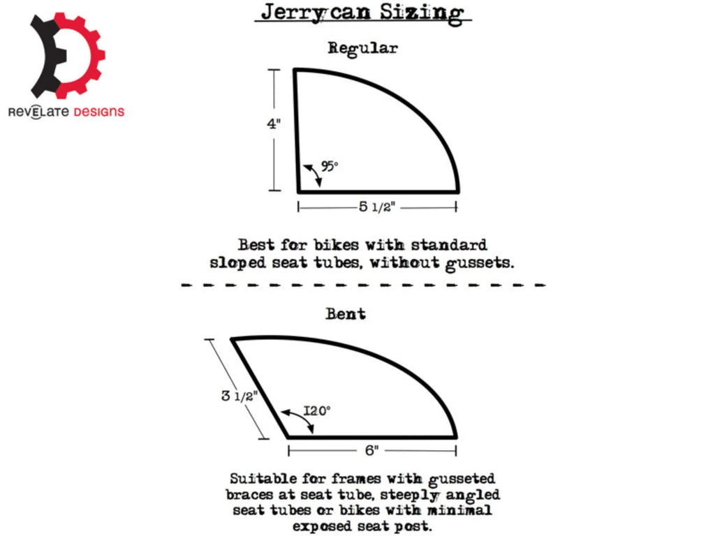 The Jerrycan® comes in two models: Regular and Bent. The Bent accommodates gusseted braces at the seat tube / top tube junction, steeply angled seat tubes or bikes with minimal exposed seat post. The Regular is the go-to for most other bikes.