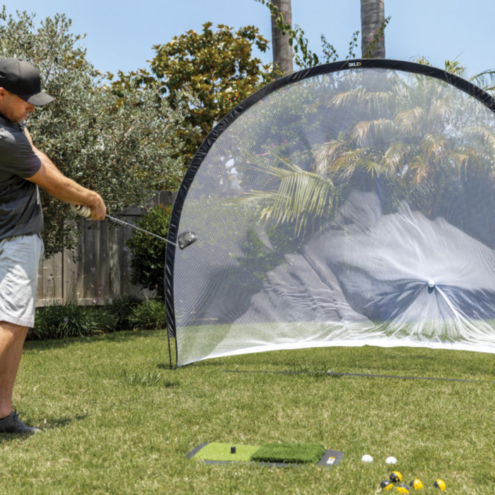 This kit includes everything you need to work on your swing at home from driver to wedge. The Home Driving Range Kit includes a 213cm (7') practice net, 12 limited-flight Impact Golf Balls, Launch Pad with rough and fairway lies and a 2.5cm (1") and 5cm (2") rubber tees. Sets up easily in your backyard, garage or basement.